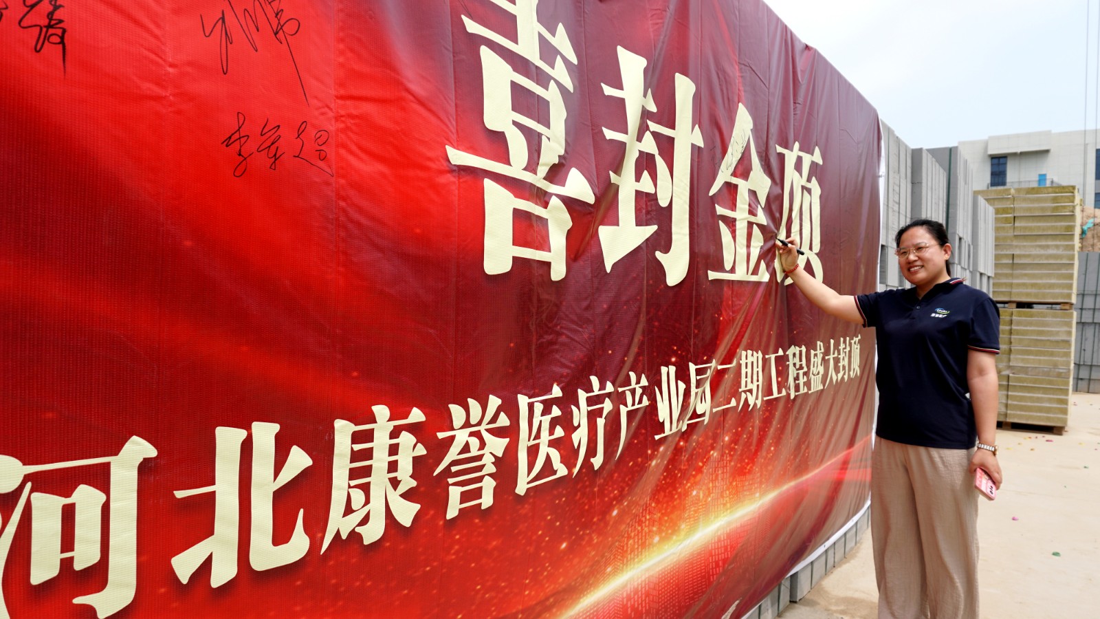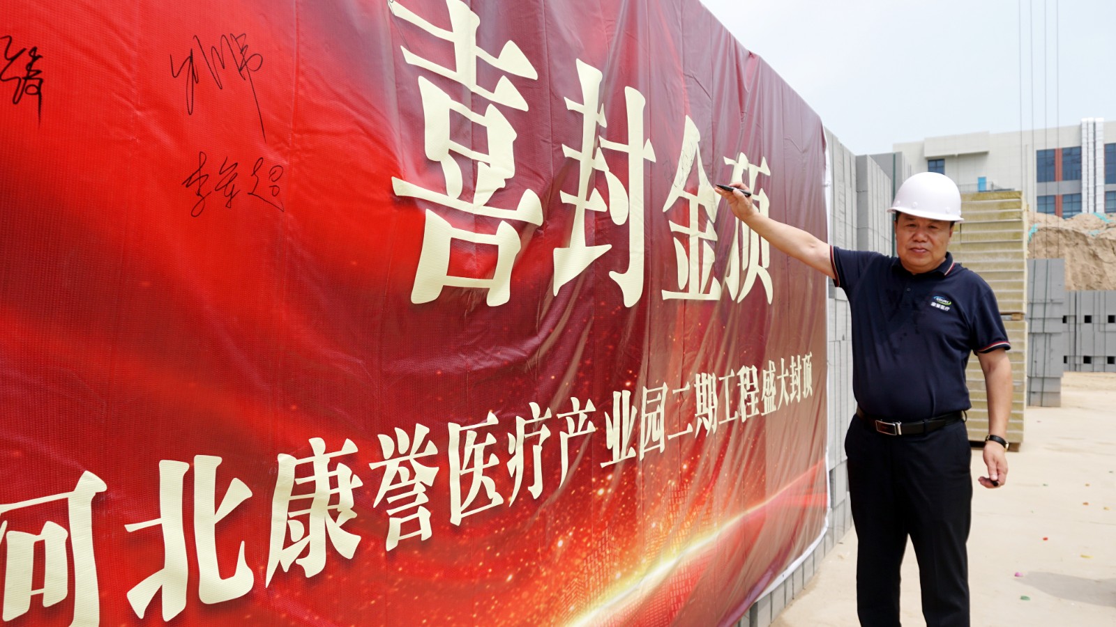 在倒班樓封頂這一重要時刻,集團副總經(jīng)理謝蘭廷、康譽醫(yī)療副總經(jīng)理張艷琴攜工程部及施工單位主要管理團隊來到現(xiàn)場,共同見證這一激動人心的建設成果。領導們紛紛在簽名墻上簽名留念,與建設者們一起合影,用鏡頭定格這一載入園區(qū)發(fā)展史冊的珍貴瞬間。