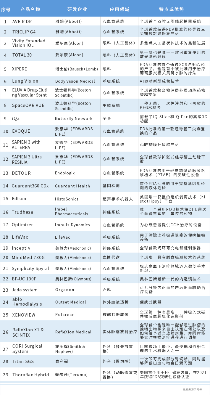 從上榜企業(yè)來看,美敦力、愛德華的入選產(chǎn)品最多,均有三款上榜;雅培、波士頓科學、愛爾康各有兩款產(chǎn)品。此外,泰爾茂、奧林巴斯、施樂輝等也有產(chǎn)品上榜。其中,心血管系統(tǒng)應(yīng)用領(lǐng)域,愛德華的Evoque(自膨脹式三尖瓣瓣膜),美敦力的Symplicity Spyral(射頻消融),雅培的AVEIR DR(全球首個雙腔無引線起搏器系統(tǒng))和TRICLIP G4(全球首款獲得FDA批準的經(jīng)導管三尖瓣緣對緣修復產(chǎn)品)等多款產(chǎn)品備受矚目,市場需求旺盛,應(yīng)用前景廣闊。此外,除上述醫(yī)療技術(shù)(產(chǎn)品),還有不少創(chuàng)新醫(yī)療技術(shù)引起了大家的廣泛關(guān)注,比如華大基因首個獲得FDA批準用于完整基因組檢測的液體活檢Guardant360 CDx。