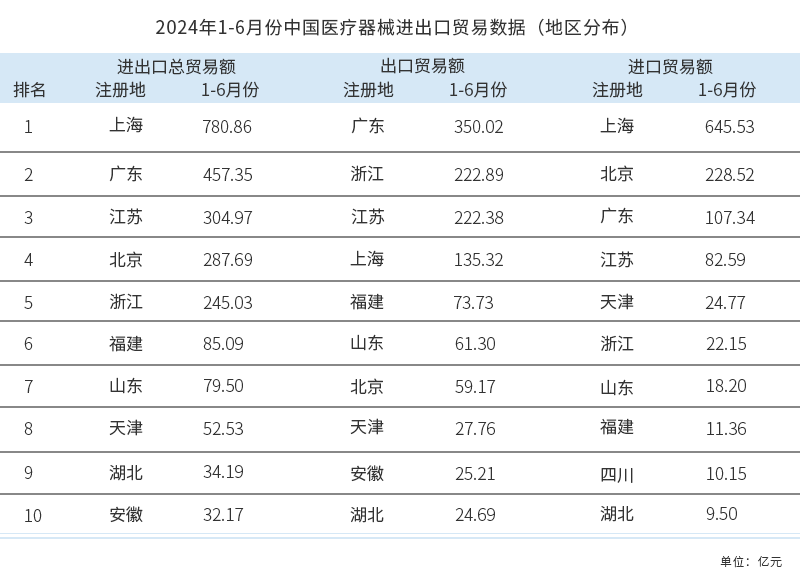 2024年1-6月份,中國(guó)醫(yī)療器械進(jìn)出口貿(mào)易詳情——地區(qū)分布