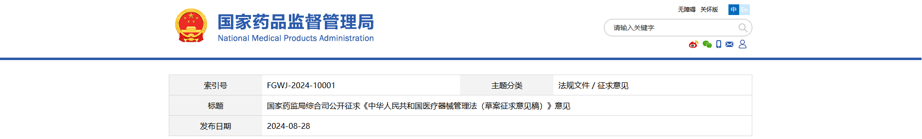 8月28日,國家藥監(jiān)局綜合司發(fā)布了公開征求《中華人民共和國醫(yī)療器械管理法(草案征求意見稿)》(以下簡稱《征求意見稿》)的公告,意見反饋截止時間為2024年9月28日。
